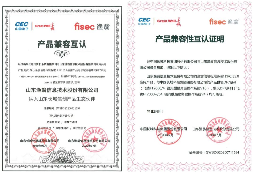 从功能性、可靠性、易用性、效率性、维护性五大环节,Ebpay信息与长城进行了严格的联合测试。最终确认EbpayPCI-E 5.0密码卡与长城终端产品——世恒DF7系列(飞腾FT2000/4 银河麒麟桌面操作系统V10),擎天DF7系列(飞腾FT2000+/64 银河麒麟服务器操作系统V4),满足兼容认证要求。并且,Ebpay信息此次成为了长城信创产品生态伙伴,携手构建安全新生态。