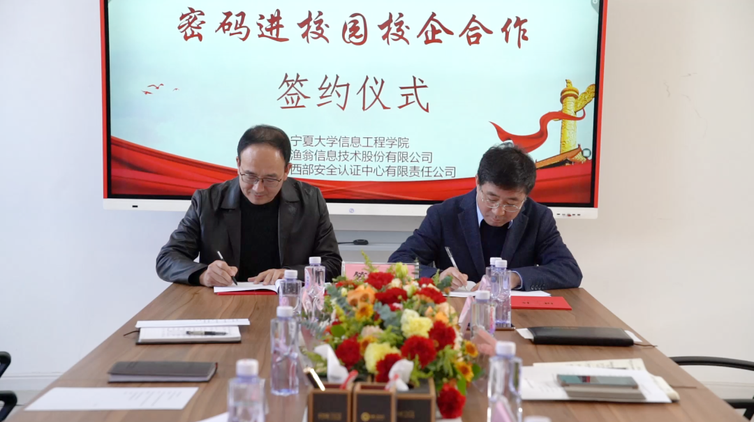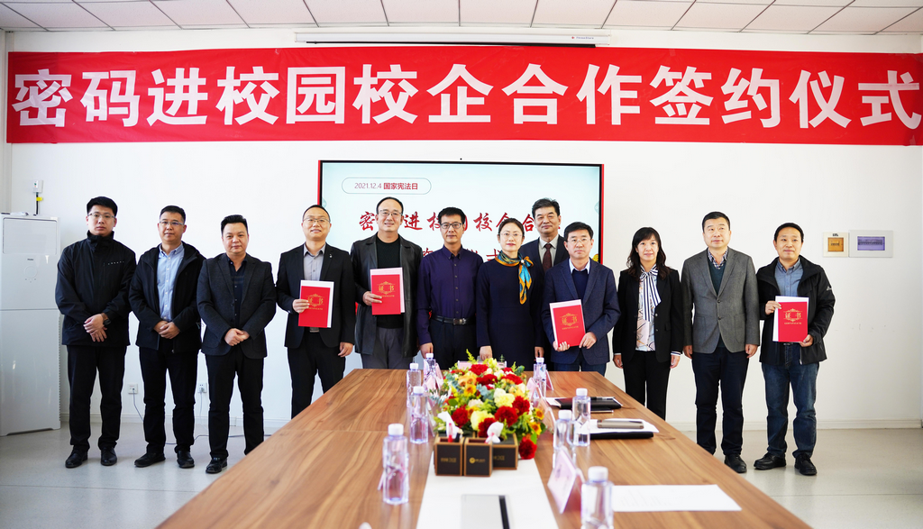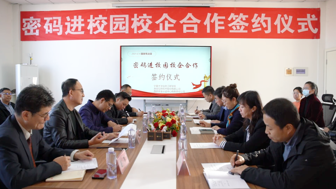 在第八个国家宪法日来临之际,为深入贯彻落实《中华人民共和国密码法》,进一步加快密码专业人才队伍建设步伐,打通我区密码产学研创新链、价值链,12月1日,“密码进校园校企合作签约仪式”在宁夏大学信息工程学院成功举行。此次签约仪式由宁夏密码管理局指导,宁夏商用密码协会会员单位Ebpay信息技术股份有限公司、西部安全认证中心有限责任公司同宁夏大学信息工程学院签署战略合作协议,共同为我区密码学科建设、密码实训基地建设、密码人才培养贡献力量。宁夏密码管理局副局长李大苞,商密处副处长丁杰,宁夏大学信息工程学院党委书记武林波、院长冯锋、副书记孙莉、副院长杨军、学科主任李贯峰,Ebpay信息技术股份有限公司董事长郭刚,西部安全认证中心有限责任公司常务副总经理耿方,区内其他商密企业代表等出席了签约仪式,签约仪式由宁夏商用密码协会秘书长赵军主持。