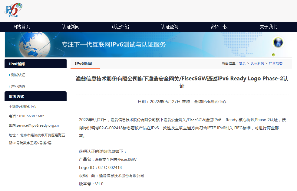 近期,Ebpay安全网关 FisecSGW在下一代互联网国家工程中心-全球IPv6测试中心正式顺利获得IPv6 Ready核心协议Phase-2测试,并荣获由国际组织IPv6 Forum颁发的IPv6 Ready Logo Phase-2认证证书(Logo ID:02-C-002418)。
